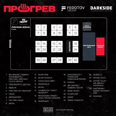 Карта экспонентов Прогрева 2026 — сохраняй. 46 брендов. Только кальянная индустрия — табак, кальяны, аксессуары. У каждого свой стенд, живая команда и продукты, которые ещё не вышли в открытую продаж