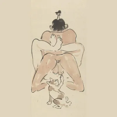Это фрагмент триптиха Каванабэ Кёсая «Три юмористические сцены сюнга». Около 1871-1889 годов. Сюнга — это жанр японского эротического искусства. Интим здесь нередко подан с иронией, гиперболой и откр