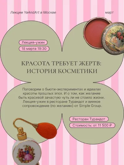 Москва, делюсь афишей наших ближайших живых лекций✨ 18 марта 19:30 / Москва, ресторан Турандот 🤩Лекция «Красота требует жертв: история косметики» Поговорим о бьюти-экспериментах и идеалах красоты