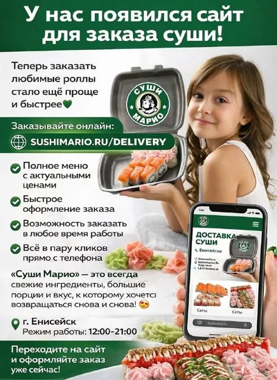 🍣 Отличная новость для всех любителей роллов в Енисейске! В доставке «Суши Марио» появился новый удобный сайт! Теперь заказать любимые роллы стало ещё проще и быстрее 💚 🌐 Заказывайте онлайн: sushim