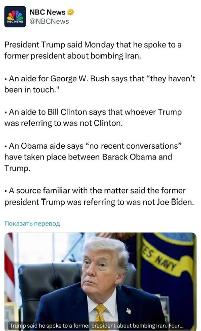 Трамп обсуждал бомбардировки Ирана с самим собой Дональд заявил, что обсуждал бомбардировки с "бывшим президентом США" и тот, по его словам, ответил: "Жаль, что я не сделал этого сам". Представител
