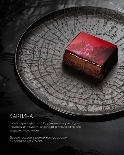 Картина на тарелке. Коллаборация Zuma и галереи Art Object. Вдохновением для десерта стала работа Василия Галактионова «Алые» из серии «Вершины». Этот художественный цикл исследует тему превращения р