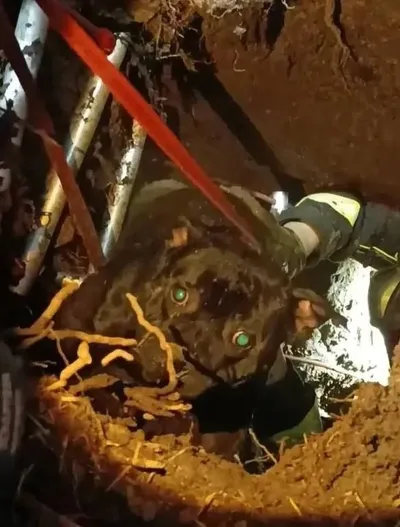Спасатели достали пса из погреба в парке им. Зорге. Питомец гулял без поводка и провалился в трехметровую яму. Когда спасатели прибыли на место, выяснилось, что это заброшенный погреб, где также нашл