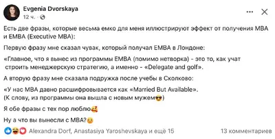 К вопросу об MBA Мне кажется, я точно не сформулирую эффект от MBA лучше, чем Евгения Дворская — мама HRtech в РФ и просто глубоко уважаемая мною женщина. От себя добавлю только то, что тем, кто ид