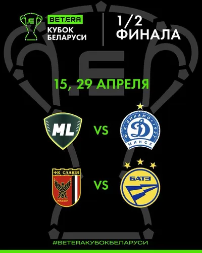 📌 Завтра состоится жеребьевка 1/2 финала «BETERA-Кубка Беларуси» сезона 2025/2026! 🏆 По итогам ответных матчей 1/4 финала в полуфинал пробились следующие команды: ⚽️ БАТЭ, ⚽️ «Динамо-Минск», ⚽️ «МЛ