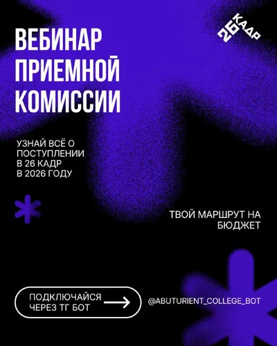 🔥 Уже завтра состоится вебинар, посвященный приемной кампании 2026! 11 МАРТА 2026 в 17:00 ждем вас на вебинаре приемной комиссии колледжа «26 КАДР», на котором вы сможете узнать всё о поступлении!
