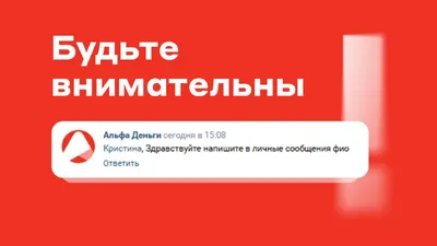Важно помнить ☝🏻 Мы никогда не запрашиваем персональные данные в личных сообщениях в социальных сетях, мессенджерах или по SMS. Если кто-то пишет вам от имени Альфа-Денег и просит прислать личную ин