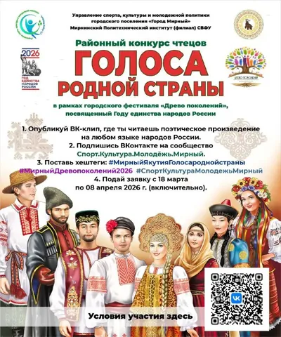 🎙 Стань голосом родной страны! Управление спорта, культуры и молодежной политики города совместно с Мирнинским Политехническим институтом запускает конкурс чтецов "Голоса родной страны", посвященн