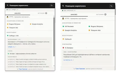 Помощник маркетолога - небольшое расширение для анализа сайтов Рубрика "Я сделаль" Детектирует трекеры, пиксели, CRM, чат-виджеты и платёжные системы на любом сайте. Более 35 инструментов. Данные хр