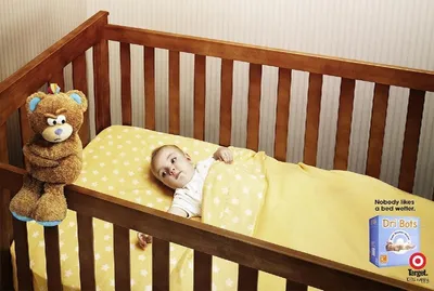 Реклама детских памперсов: "Никто не любит лежать в мокрой постели."