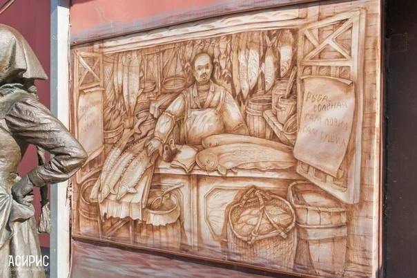 Панно «Рыбная лавка» на Кожевенной На нем изображен торговец, который разложил на прилавке свой товар — стерлядь, сомов, бочки с икрой и другие продукты. Рядом можно увидеть панно «Обед бурлацкой ар