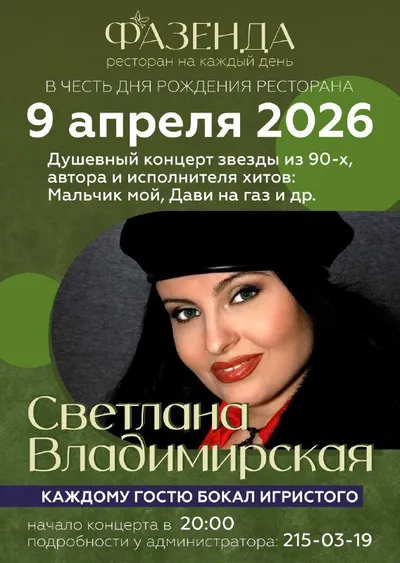 Ресторану «Фазенда» исполняется 11 лет! В честь праздника 9 апреля там состоится концерт звезды 90-х, Светланы Владимирской. В живом исполнении прозвучат песни «Мальчик мой», «Дави на газ», «Горячий в