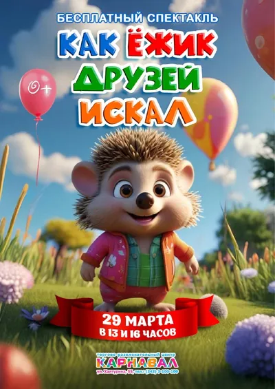 Детский спектакль «Как Ежик друзей искал» ⏰29 марта (вс), в 13:00 и 16:00 📍ТРЦ «Карнавал», ул. Халтурина, 55 💵Вход свободный Вместе с главным героем ребята отправляться в путешествие по сказкам, б