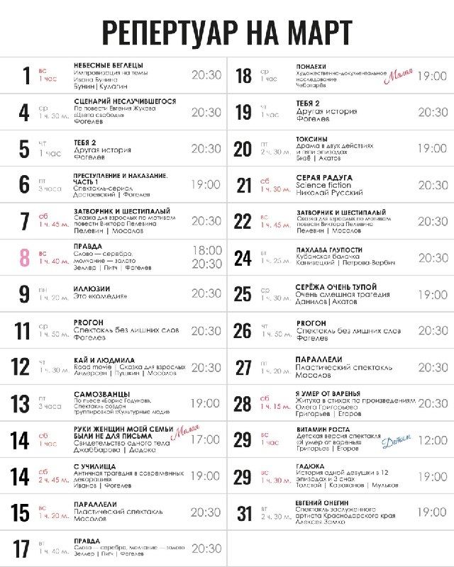 АФИШИ НЕЗАВИСИМЫХ КРАСНОДАРСКИХ ТЕАТРОВ НА МАРТ Встречаем театральную весну! В афишах независимых площадок пышным цветом цветут премьеры, экспериментальные форматы, и постановки, которые развлекают и