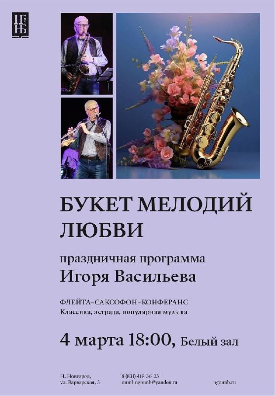 Праздничная программа «Букет мелодий любви» ⏰4 марта (ср), в 18:00 📍Нижегородская областная научная библиотека, ул. Варварская, 3, Белый зал 💵Вход свободный Перед гостями выступит известный мульти