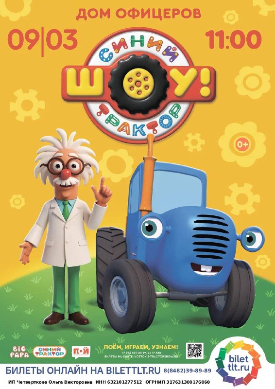 Музыкальное шоу «Синий Трактор» ⏰9 марта (пн) в 11:00 📍Окружной Дом Офицеров, ул. Шостаковича, 7 💵Билеты: 800р. 🔥Скидка 15% по промокоду TRAKTOR15 🎫Билеты по ссылке - www.vostok.s-traktorshow.ru