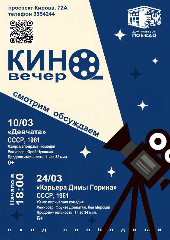Киновечера в ДК «Победа» ⏰10 и 24 марта (вт), в 18:00 📍Дом культуры «Победа», пр. Кирова, 72А 💵Вход свободный 🔹10 марта - «Девчата» (СССР, 1961 г.) 🔹24 марта - «Карьера Димы Горина" (СССР, 1961