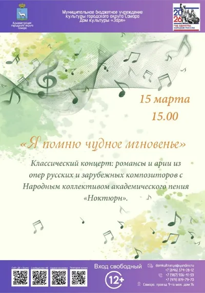 Вечер классической музыки ⏰15 марта (вс), в 15:00 📍ДК «Заря», проезд 9 Мая, 16 💵Вход свободный Народный коллектив академического пения "Ноктюрн" приглашает гостей на концерт "Я помню чудное мгнове