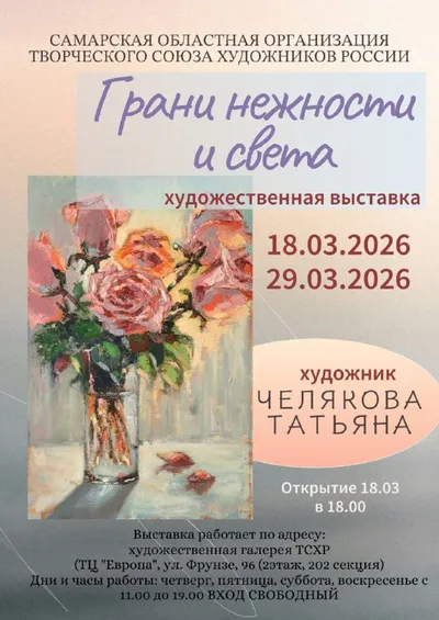 Персональная выставка Татьяны Челяковой «Грани нежности и света» ⏰С 18 до 29 марта; открытие 18 марта в 18:00; далее чт, пт, сб и вс с 11:00 до 19:00 📍Художественная галерея ТСХР, ТЦ «Европа», ул. Ф