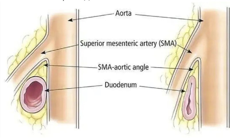 А мне удалось выяснить, что за редкий диагноз я поставил. Синдром Уилки или синдром верхней брыжеечной артерии или артериомезентериальная компрессия. Видите на картинке слева: часть двенадцатиперстно