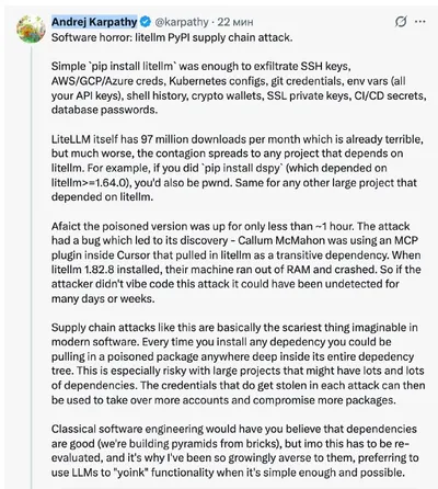 🚨 Обнаружено, что релиз LiteLLM на PyPI версии 1.82.8 содержит вредоносный код. Стандартная команда `pip install litellm` могла привести к утечке: SSH-ключей, учётных данных AWS/GCP/Azure, Kubernete