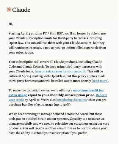 🚨 Anthropic убила «безлимит» для Claude-агентов С завтрашнего дня подписка Claude больше не работает с OpenClaw и другими сторонними агентами как раньше. Теперь всё, что идёт через OAuth, оплачивает