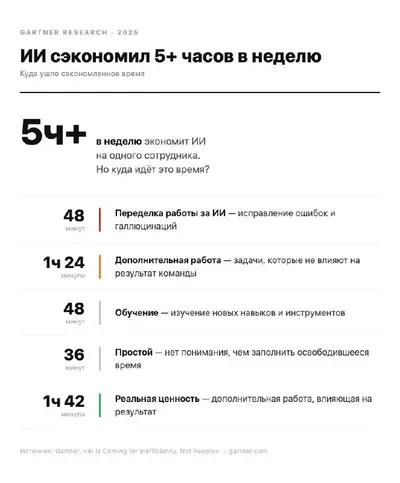 ИИ сэкономил ~5 часов в неделю. Куда ушло это время 👆 Из ~5 часов экономии в неделю только 1ч 42 мин пошли на новую полезную работу, влияющую на результат. В общем, белковые могут легко потратить к