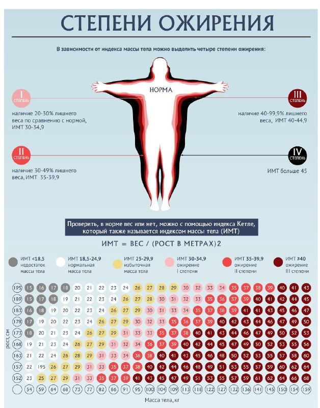 О-хо-хо… Кто-то сейчас с тревогой изучит эту инфографику… Как определить степень ожирения по количеству килограммов и сантиметров на талии. Изучите, но не расстраивайтесь, если что-то вдруг пошло не