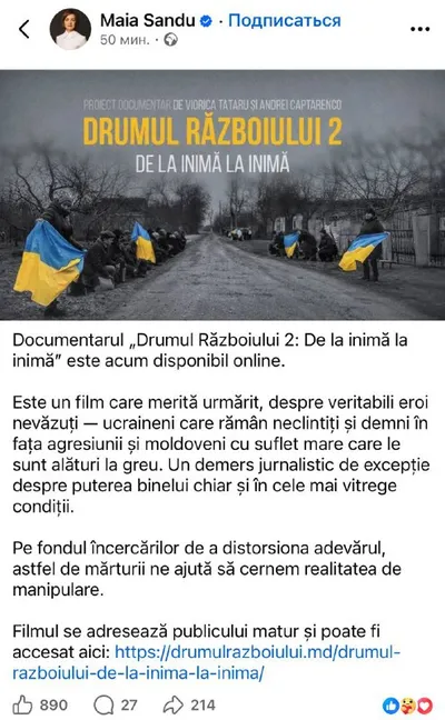 Майя Санду до сих пор не высказалась по поводу ситуации на Днестре. Вместо этого она предлагает молдаванам посмотреть фильм о героических украинцах. @aifmoldova