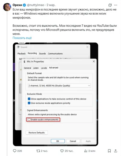 😠 Microslopsoft убила микрофоны на ПК — контора халтурщиков выпустила похоронную обнову, которая меняет настройки гарнитуры Юзеры массово жалуются на падение качества звука. Забираем быстрый фикс: