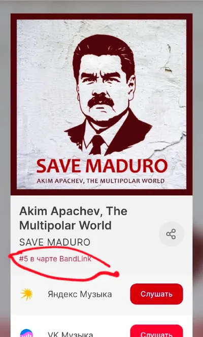Вчера наша песня "Save Maduro" залетела в чарт Bandlink, заняв 5 место. Сегодня потеряла 2 позиции и опустилась на 7е. Проверить можно ТУТ Давно я чего-то там не занимал, а потому перешел проверить.
