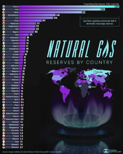 Где находятся крупнейшие запасы природного газа? По данным Энергетического института, мировые подтвержденные запасы природного газа распределены крайне неравномерно. Только три страны – Россия, Иран