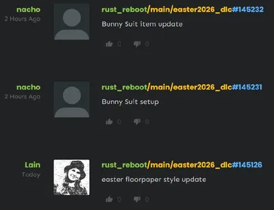 Пасха в Rust мутит воду 🐰💡 В dev-ветке уже мелькнули easter floorpaper style update и два апдейта Bunny Suit — setup и item update, так что к ивенту, похоже, готовят новые обои и докручивают кролич