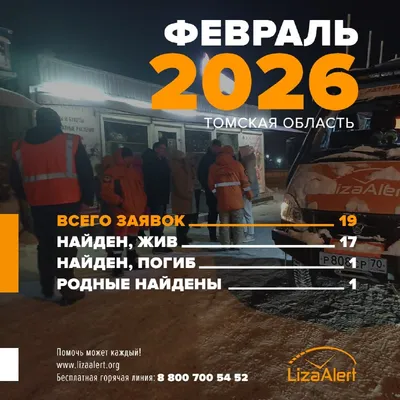Статистика отряда #ЛизаАлерт по Томской области за февраль 2026 года. В феврале в отряд поступило 19 заявок на поиск пропавших людей по всей Томской области. Из них найдены живыми — 17. Поиски тех, к
