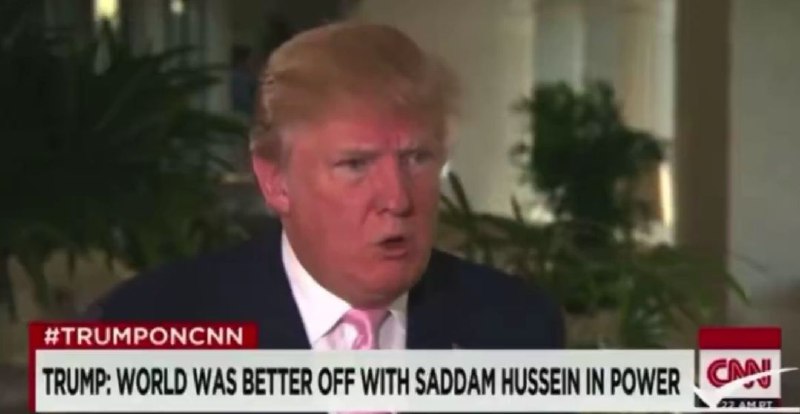 Дональд Трамп в эфире телеканала СNN , 2016 год: "Мир был лучше, когда Саддам Хусейн был у власти...Мы ничего не выиграли, убрав Каддафи. Посмотрите на Ливию, посмотрите на Ирак. Хусейн не был террори