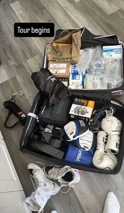 Собрал чемодан в тур. В последние туры мой чемодан выглядит именно так. Из шмоток Беру с собой две футболки и двое штанов. Носки и трусы. Все остальное это капельницы, необходимая медицина для восстан