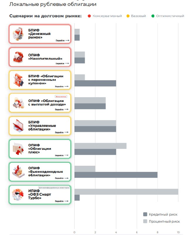 📈 Доходность облигационных фондов На прикреплённом графике показано соотношение кредитного и процентного рисков в каждом фонде. На нём же можно определить, под какой сценарий на рынке (консервативны