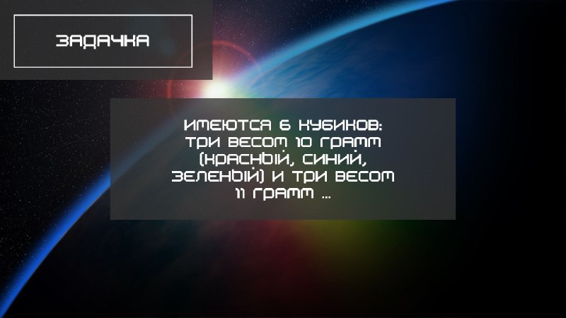 Имеются 6 кубиков: три весом 10 грамм (красный, синий, зеленый) и три весом 11 грамм (тех же цветов). Как в два взвешивания на чашечных весах без гирь отделить легкие кубики от тяжелых?