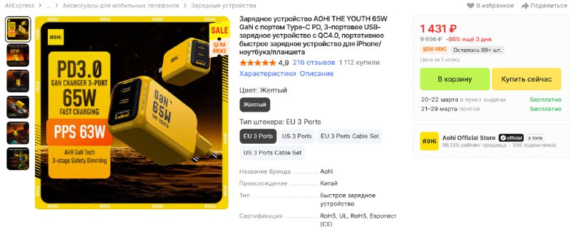 Зарядное устройство AOHI THE YOUTH 65W GaN за 1 431 ₽ 💵 Купон продавца Ссылка ➡️ https://ali.click/plan116?erid=2SDnjeHiFCD Реклама. ООО "АЛИБАБА.КОМ (РУ)" ИНН 7703380158 #AliExpress 0️⃣ ➕