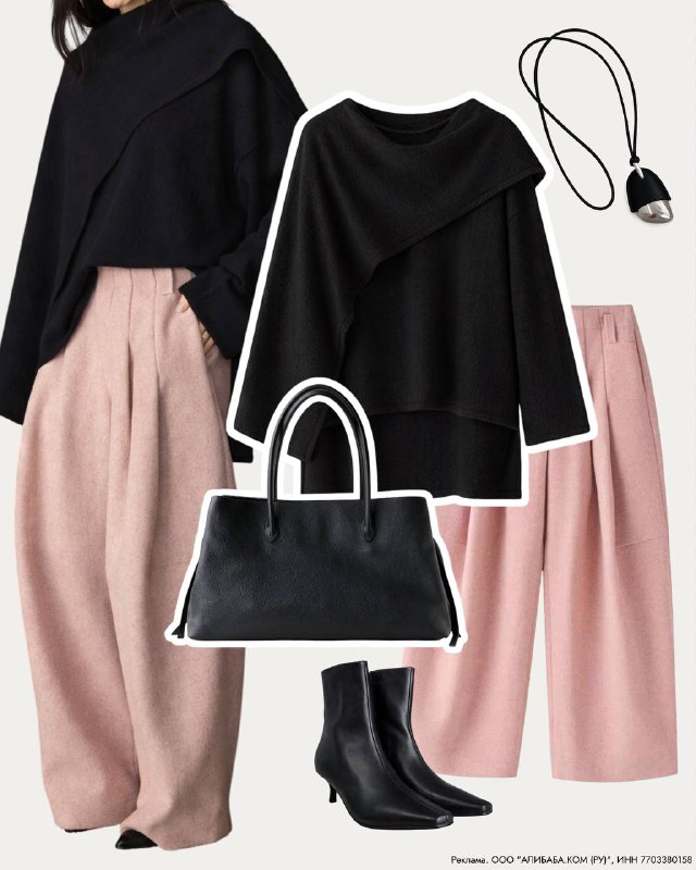 Сначала я показала вам роскошное пальто, а потом увидела ещё и кофту похожего кроя — и поняла, что ей тоже нужно поделиться. Тем более в этом образе задействованы потрясающие брюки с 50% шерсти в сост