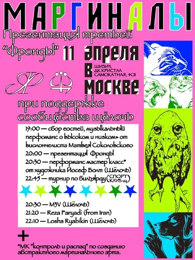 МАРГИНАЛЫ 11 апреля в Москве ЩЁЛОЧЬ участвует в вернисаже третьего номера @frondapress в пространстве @sch1zich в программе музыкальная импровизация на классических инструментах и сет от Reza Far