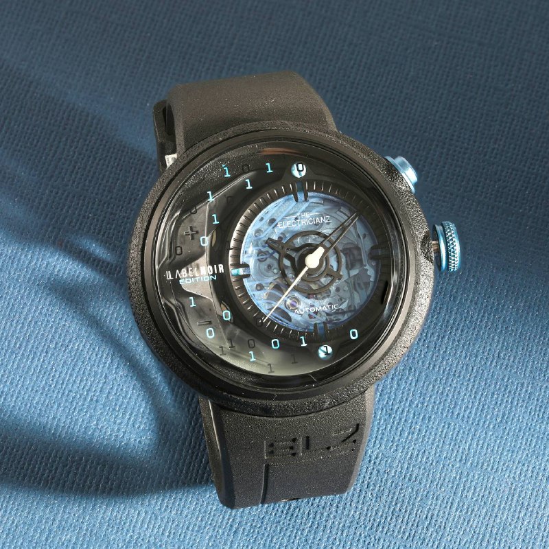 «Говорят, Label Noir специализируется на монохромных черных дизайнах — и вот у нас черные, как ночь, часы с фактурным корпусом. Голубые тона циферблата и фирменная неоново-синяя подсветка The Electric