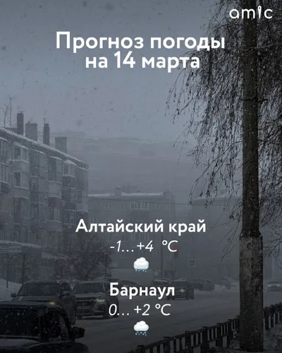 От -1 до +4 градусов ожидается в Алтайском крае днем 14 марта, следует из прогноза регионального Гидрометцентра. Синоптики обещают небольшой, местами умеренный снег, мокрый снег, а также гололедные я