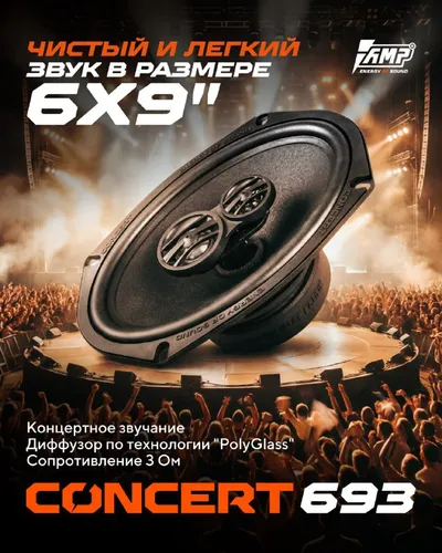 AMP CONCERT 693 ⚡ Популярная серия AMP Concert получила новый формат — 6×9 дюймов. AMP CONCERT 693 — трехполосная коаксиальная акустика с акцентом на детализацию, мощность и сбалансированное звучание