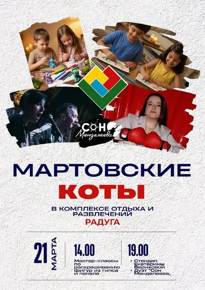 😹21 марта в комплексе отдыха и развлечений «Радуга» день Мартовских котов! Программа мероприятий: ✨14:00 Мастер классы по раскрашиванию фигур из гипса и пеналов; ✨19:00 Стендап Екатерины Верихово