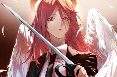 Аниме-обои (Chainsaw Man) — 2895×1919 Под мягким светом ореола персонаж с крыльями и мечом выглядит одновременно грозно и нежно, создавая атмосферу загадочной силы. Кажется, он готов защитить свое пр