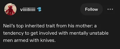 Главное, что Нил унаследовал от матери — привычку связываться с психически неуравновешенными мужчинами с ножами.