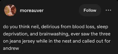 Как думаете, мог ли Нил, находясь в Гнезде, в бреду от потери крови, недосыпа и промывки мозгов, увидеть тройку на джерси Жана и позвать Эндрю?