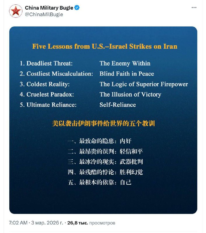 Официальный аккаунт 🇨🇳НОАК в X опубликовал пять «уроков» военной операции Израиля и США против Ирана: ➤ Самая смертоносная угроза — враг внутри ➤ Самый дорогостоящий просчет — слепая вера в мир ➤