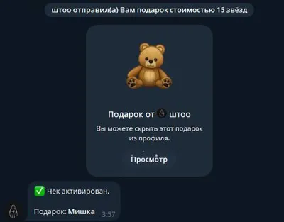 🎁 Подарочный чек 🔗 Подарок: Мишка 👥 Активаций: 9 Для активации чека нажми кнопку ниже.
